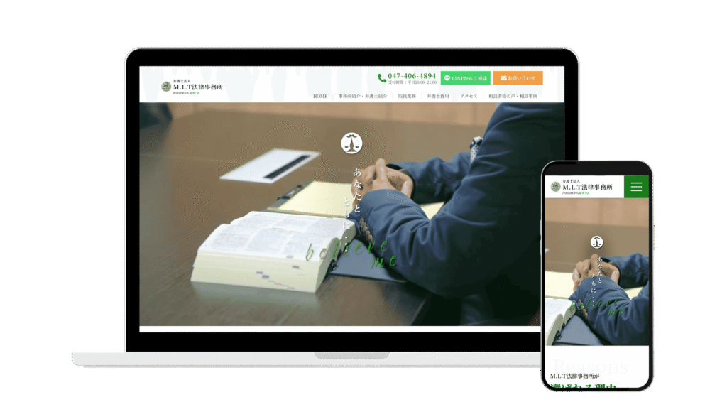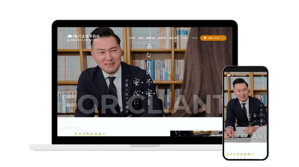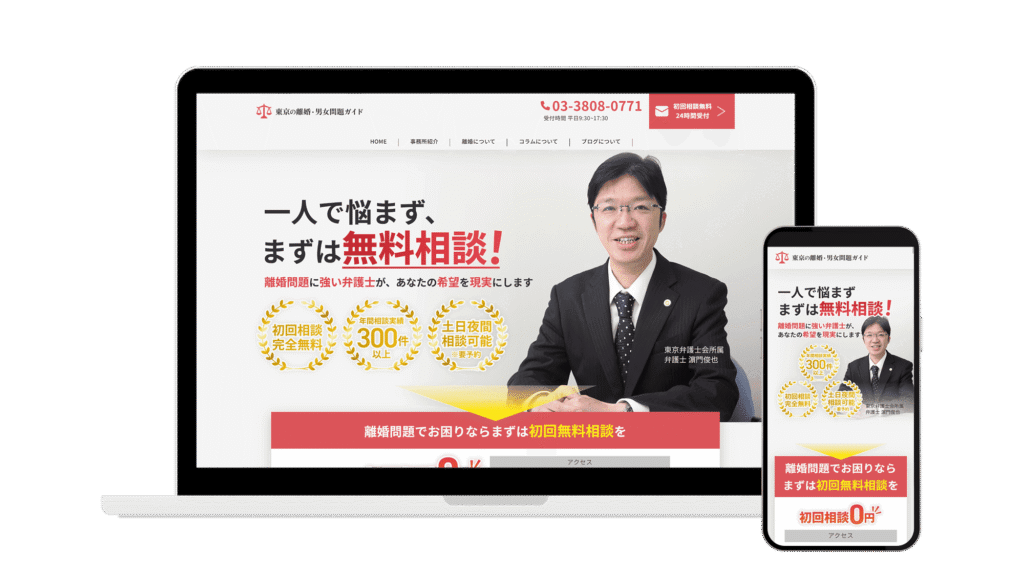 前職時代からほぼ10年のお付き合いをいただいている代表の福世先生。福世先生はもちろん、他の弁護士さん、事務員さん含めて、とてもチームワークの良い事務所で、訪問するのがいつも楽しみです。デザインと導線の最適化により、CV率の改善に加えて、LINE相談が1.5〜2倍に増加し、津田沼エリアで圧倒的No.1を実現できました。今後のさらなる成長をWebの側面から支えてまいります。